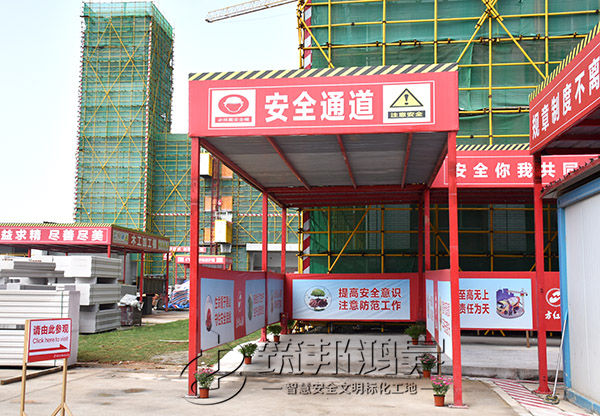 安全通道,施工現場實行人車分流,主要人員出入通道搭設了專用安全通道,安全通道兩側設置宣傳欄,提升施工作業人員的質量意識、安全意識。