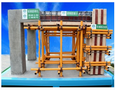展示工藝:雙鋼管固定,支撐模剪刀撐,砼施工縫鑿毛,雙螺母加固,砼成型展示,柱底清掃口,柱模板加固,柱鋼筋綁扎,梁底清掃口,梁模板加固,梁鋼筋展示,板鋼筋綁扎,對拉螺桿加固。