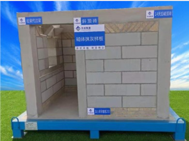 展示工藝:墻體砌筑、包含墻體砌筑、粉灰,根部預先澆筑200高的C20素混凝土墻基,包含混凝土反坎及鋼筋支模展示,砌體抹灰,樓面防水,H型立管排水管道展示,煙道反坎,門洞缺口梁,線盒、等電位端子箱預埋等工藝。