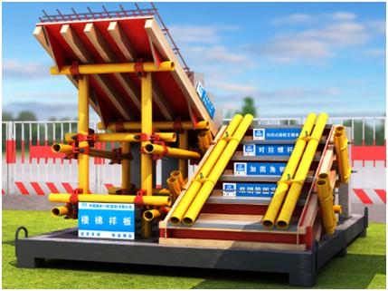 工藝展示:雙鋼管固定、對拉螺桿、樓梯支模體系、樓梯施工縫留設1/3處、施工縫鑿毛、清掃口、支撐模剪刀撐、梯板鋼筋綁扎、混凝土成品展示、樓梯模板卡槽式支護與加固等工藝。