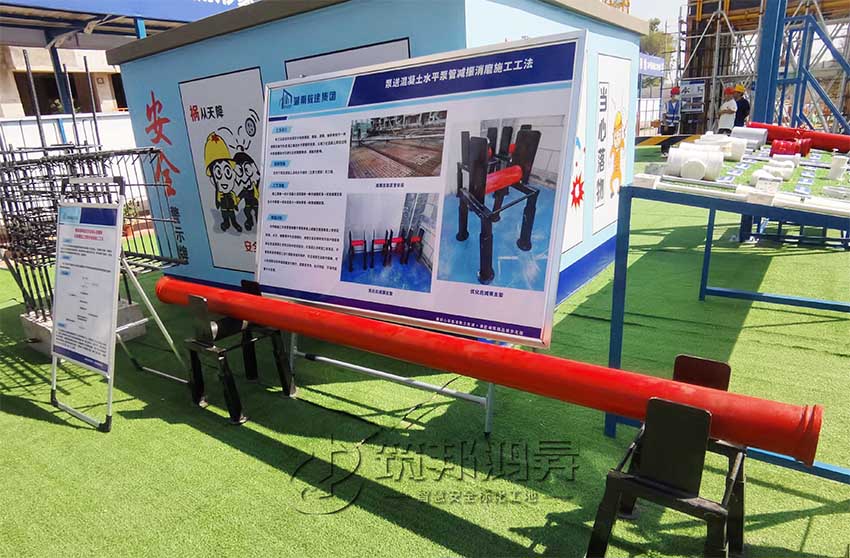 在觀摩會現場,還有一個紅色圓柱外形的東西吸引了眾多觀摩人員的注意。湖南教建集團有限公司國欣向榮廣場項目項目總指揮長李海平介紹,這是其公司自創的泵送混凝土水平泵管減振消磨施工工法。該工法運用的關鍵在于利用鋼筋、鋼板、滾筒、軸承等制作一種減振支架作為混凝土輸送水平泵管的支座,以減少在混凝土泵送過程中泵管振動對已綁扎好的鋼筋骨架、模板的影響。