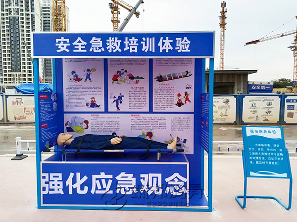 此次合作的安全教育培訓體驗區建設包括了電焊機操作體驗、安全急救培訓體驗、安全帶使用體驗、平衡木體驗、鋼絲繩使用體驗、欄桿推倒體驗、洞口墜落體驗、重物搬運體驗、綜合用電體驗、滅火器演示體驗、安全防護用品展示體驗、安全帽撞擊體驗等。筑邦安排專車送貨到廈門工地,同時安排了專業人手迅速到工地加班加點完成安裝。