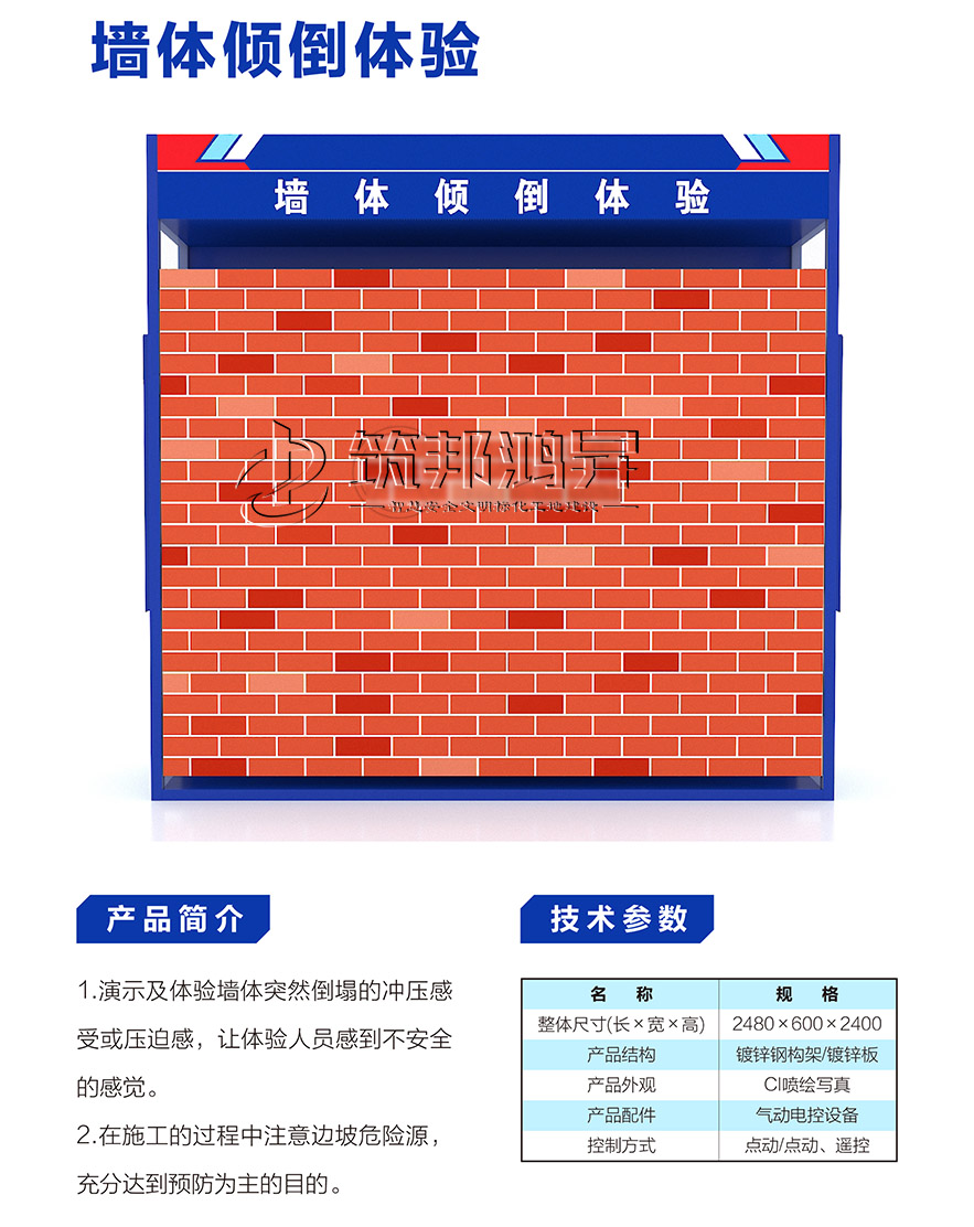 【筑邦鴻昇】安全體驗館內一般配置安全帶使用體驗、洞口墜落體驗、消防器材演示體驗、安全帽撞擊體驗、綜合用電體驗、現場急救體驗、平衡木體驗、鋼絲繩使用體驗、安全防護用品展示培訓、垂直爬梯演示體驗、鋼絲繩演示體驗、吊運體驗、欄桿推倒體驗、平衡橋/斜屋面行走體驗、機械傷害體驗、移動式平臺傾倒、電焊機操作體驗、重物 等搬運體驗、墻體傾倒體驗、人字梯體驗等幾十種體驗設施。這些基本涵蓋了建筑施工現場容易發生安全事故的危險源。